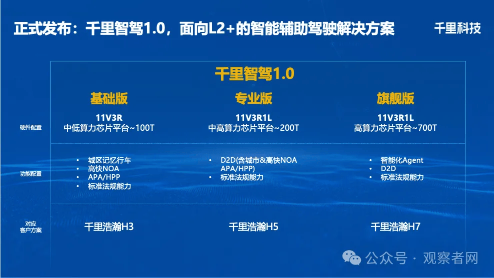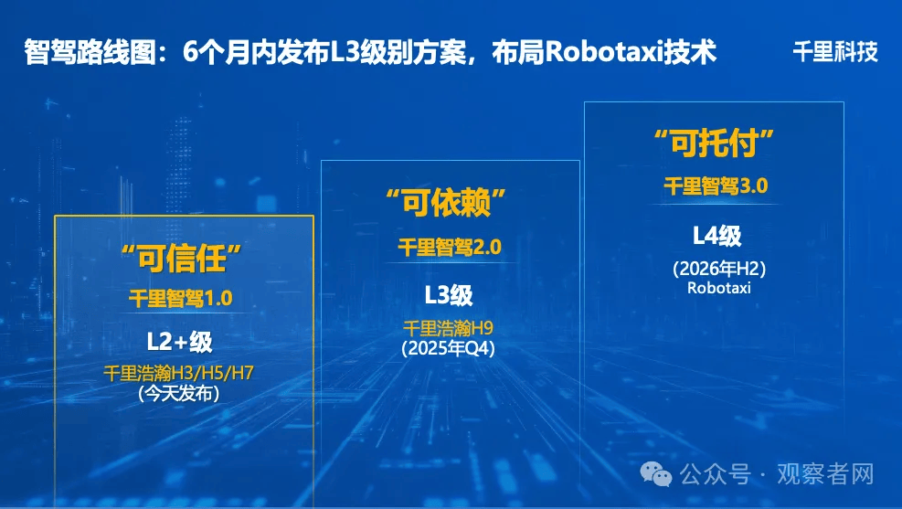 千里智驾1.0方案分为基础版、专业版和旗舰版三大类别,分别对应千里浩瀚H3、H5、H7三个方案。其中,旗舰版搭载了行业顶级的700TOPS算力,可实现多场景自主决策与复杂交互等核心功能。千里科技还透露了未来六个月内将发布L3级别智驾方案——千里智驾2.0,并在2026年下半年推出面向Robotaxi场景的L4级智驾方案——千里智驾3.0。