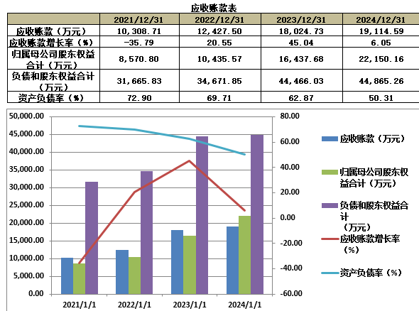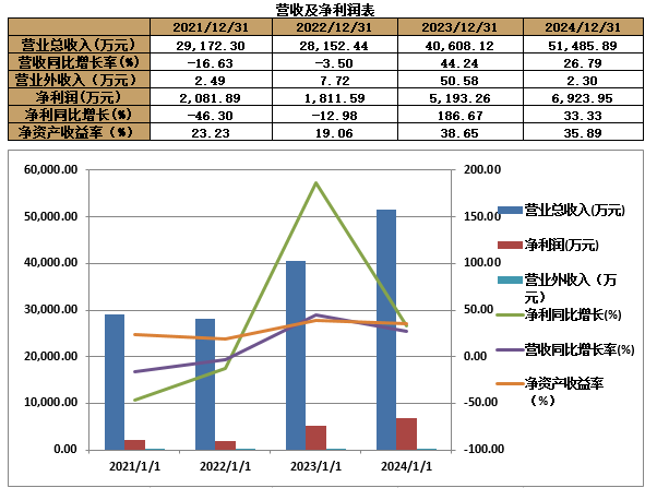 业绩情况:2021-2024年底,公司的营业收入分别为29172.30万元、28152.43万元、40608.12万元、51485.88万元,年均复合增长率为20.85%;归母净利润分别为2081.8万元、1811.59万元、6923.95万元,年均复合增长率为82.37%。