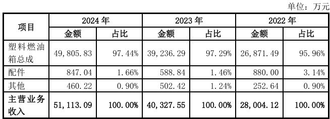 公司主营业务为汽车燃料系统的研发、生产和销售,主要产品为汽车塑料燃油箱总成。公司主要面向整车制造企业进行销售,主要产品具有轻量化、低排放、抗静电、低噪音、安全性高等特点,主要客户包括吉利汽车、奇瑞汽车、中国一汽、长安汽车等国内主流整车制造企业。