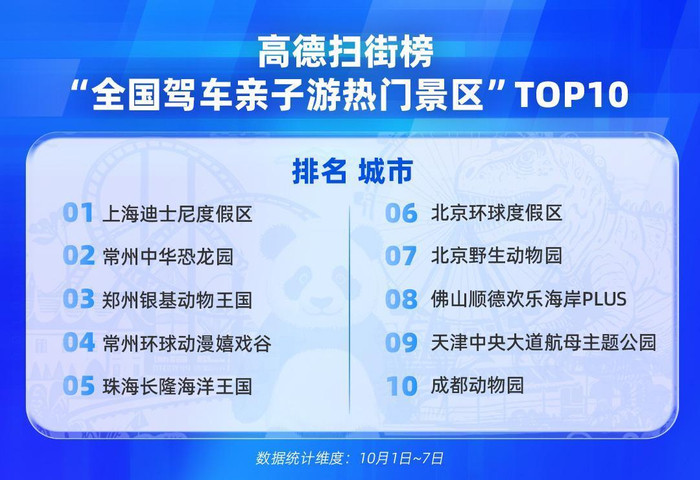 “全国十大驾车亲子游热门景区”分别是:上海迪士尼度假区、常州中华恐龙园、郑州银基动物王国、常州环球动漫嬉戏谷、珠海长隆海洋王国、北京环球度假区、北京野生动物园、佛山顺德欢乐海岸PLUS、天津中央大道航母主题公园、成都动物园。有趣的是,通过苏超联赛火爆出圈的常州有两个景区上榜。